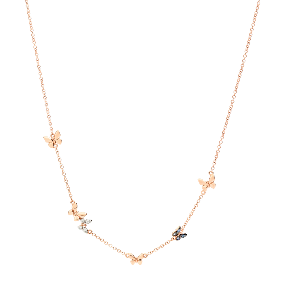 Collana Farfalla in oro rosa 9K con 4 diamanti bianchi (ct 0.04) e 4 zaffiri blu (ct 0.05). Piastrina in oro rosa 9K.