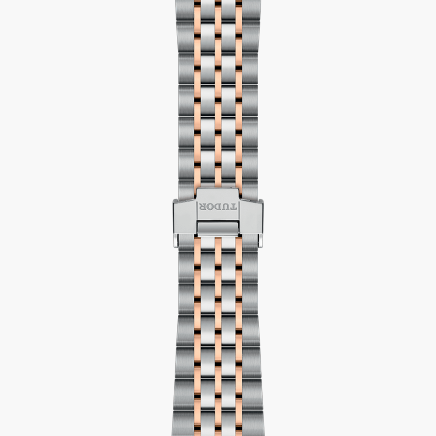 Bracciale in acciaio e oro rosa, 7 file, maglie esterne satinate, maglie centrali lucide, con chiusura pieghevole e fermaglio di sicurezza