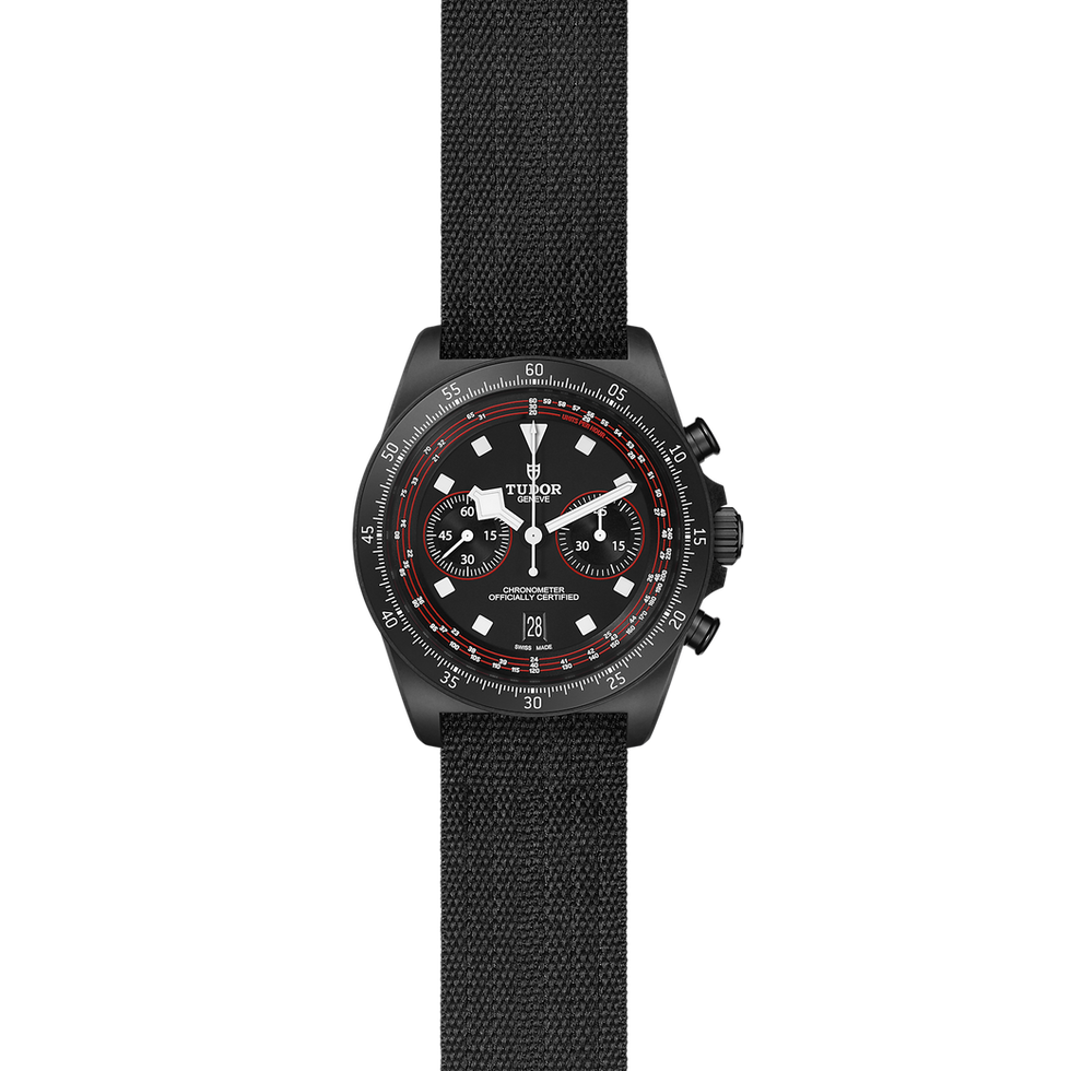 - Quadrante: Nero, opaco, dettagli rossi sui contatori del cronografo e sulla scala tachimetrica